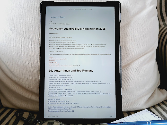 In Buchhandlungen liegt die Broschüre in gedruckter Form auf, doch sie ist nicht in allen Buchhandlungen erhältlich und rasch vergriffen. NetGalley Deutschland stellt die Broschüre in elektronische Form, herausgegeben vom „Börsenblatt“, kostenlos zum Download bereit, in dieser Form habe ich sie gelesen. Es ist ein interessanter Überblick über die nominierten Romane. Die Leseproben sind definitiv eine Entscheidungshilfe und man bekommt Lust, das eine oder andere Buch, an das man bisher nicht gedacht hatte, doch zu lesen. Die großartigen „Lichtungen“ von Iris Wolff habe ich bereits gelesen, „Das Wohlbefinden“ von Ulla Lenze lese ich gerade und als nächstes wage ich mich an die eintausend Seiten „Die Projektoren“ von Clemens Meyer. Die deutsche Longlist 2024 umfasst neben der schon vorher vermuteten Titel auch wieder einige Überraschungen.